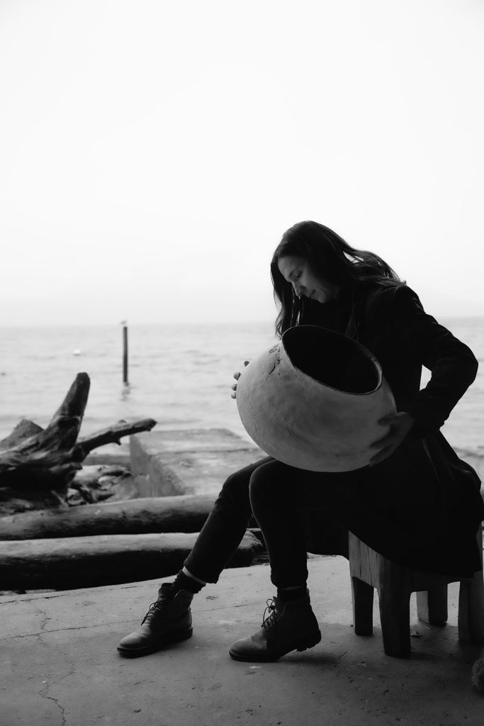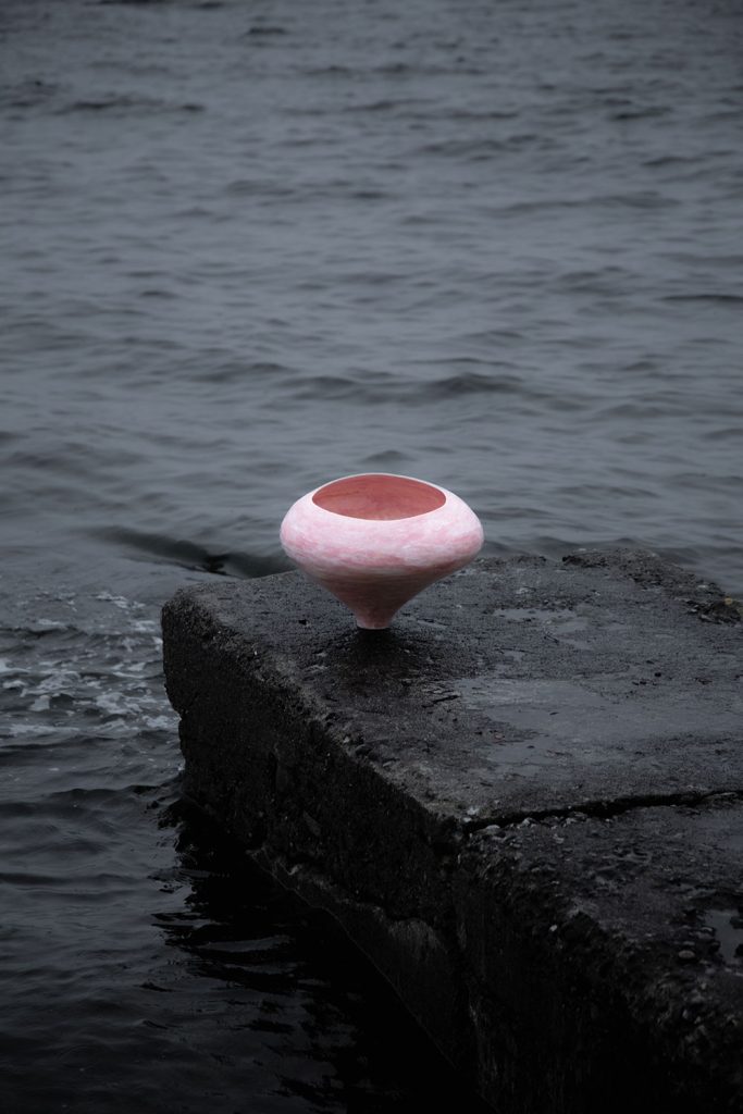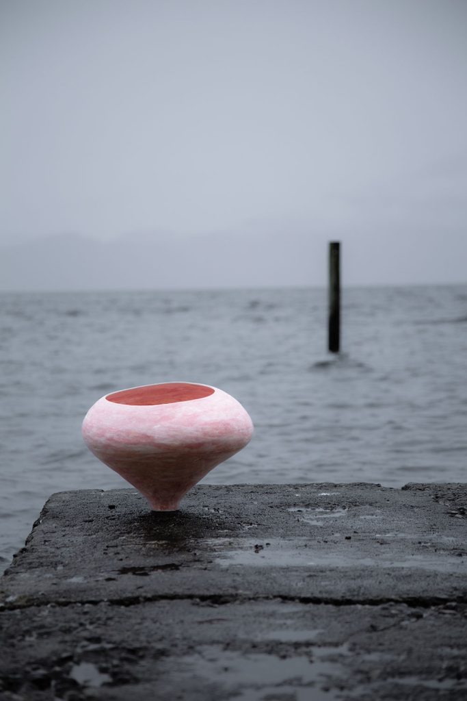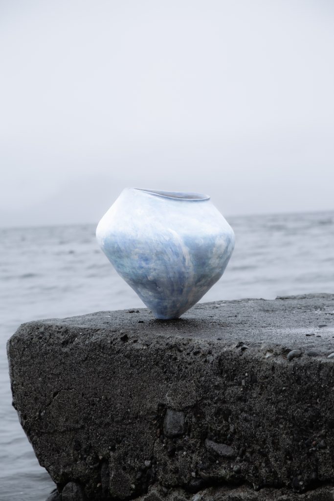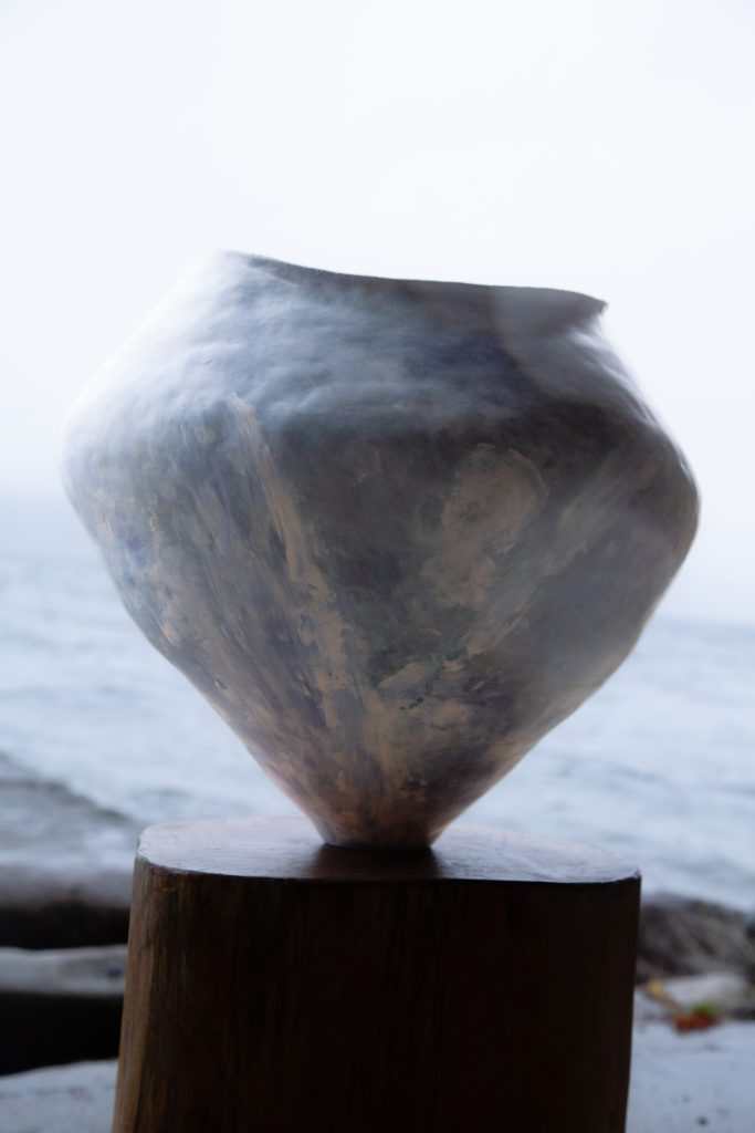 This piece is a stoneware coil-built vessel layered with porcelain-coloured slip. I sought to capture the ever-changing sky and sea in a swirl of wind and sea spray.